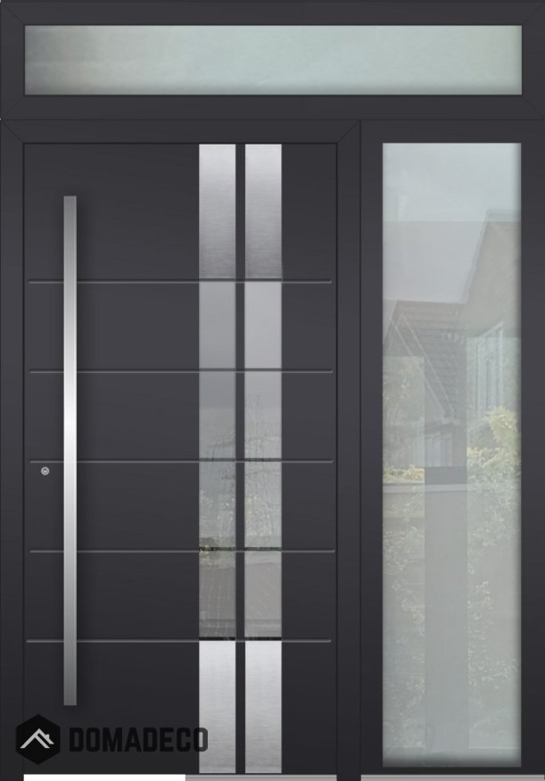 The right glass panel of the door offers a glimpse into the interior space, creating a seamless connection between the inside and outside. This feature not only adds visual interest to the door but also allows for natural light to filter through, brightening up the entryway and creating a welcoming atmosphere. The top glass panel serves a similar purpose by further enhancing the door's aesthetic appeal and inviting light into the space, making for a more inviting and well-lit entryway.