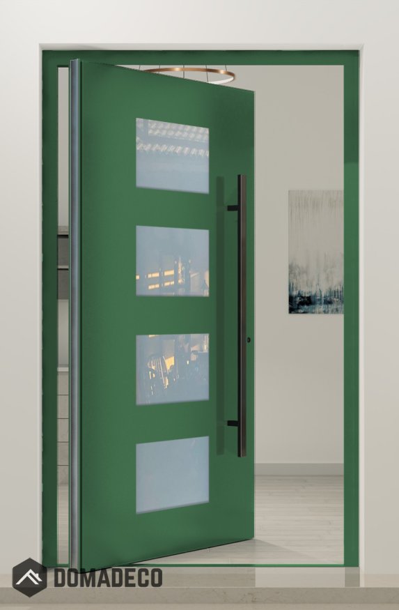 Introducing the PIVOT C2 aluminum pivot door with four glass panels - a true masterpiece of modern design and architectural ingenuity. This exceptional door combines the strength and sophistication of aluminum with the elegance and transparency of glass to create a striking entryway that instantly captivates the eye. The sleek aluminum frame of the PIVOT C2 exudes a contemporary allure, while the four expansive glass panels invite natural light to flood the space, creating a seamless connection between indoor and outdoor environments.
