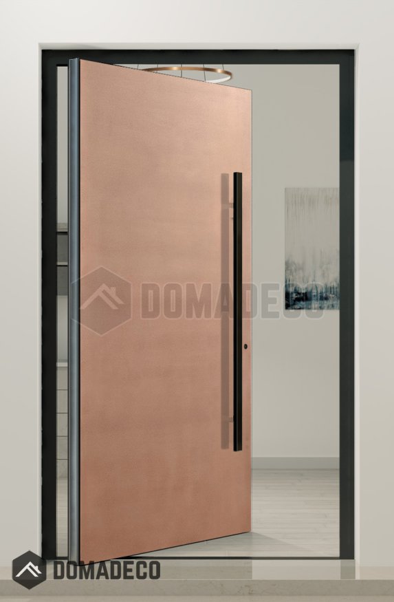 This pivot door is are covered with liquid metal. Liquid metal is a natural and ecological material that offers limitless design possibilities. Its combination of powdered metal and resins creates a durable and visually striking end result. With skilled craftsmanship and the use of modern application techniques, liquid metal can transform any space into a work of art while being mindful of the environment.