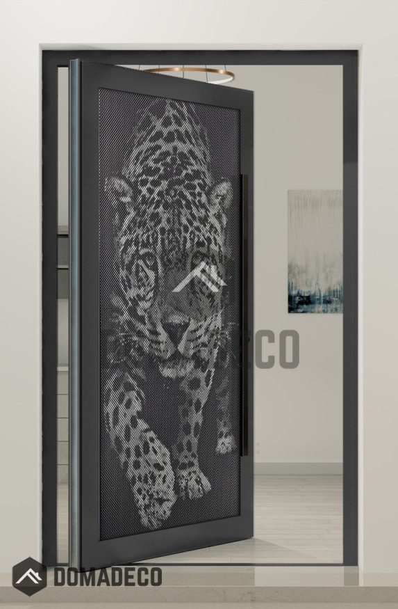 PIVOT G5 - Glass aluminium pivot door with with tiger motif in decorative panel