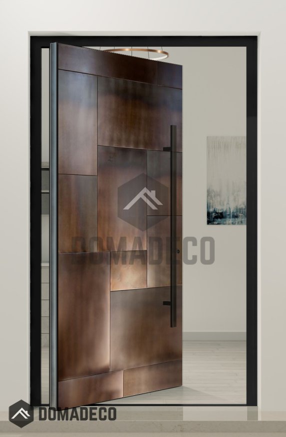 This pivot door is are covered with liquid metal. Liquid metal is a natural and ecological material that offers limitless design possibilities. Its combination of powdered metal and resins creates a durable and visually striking end result. With skilled craftsmanship and the use of modern application techniques, liquid metal can transform any space into a work of art while being mindful of the environment.